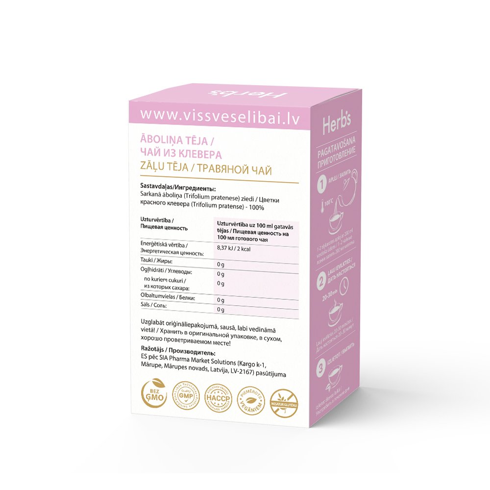 Sastāvdaļas: Sarkana aboliņa (Trifolium pratenese) ziedi-100%