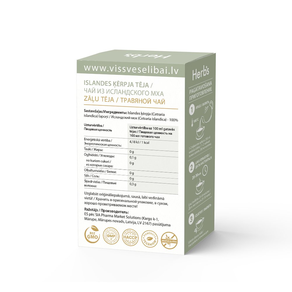Sastāvdaļas: Islandes ķērpja (Cetrariais landica) lapoņi – 100%