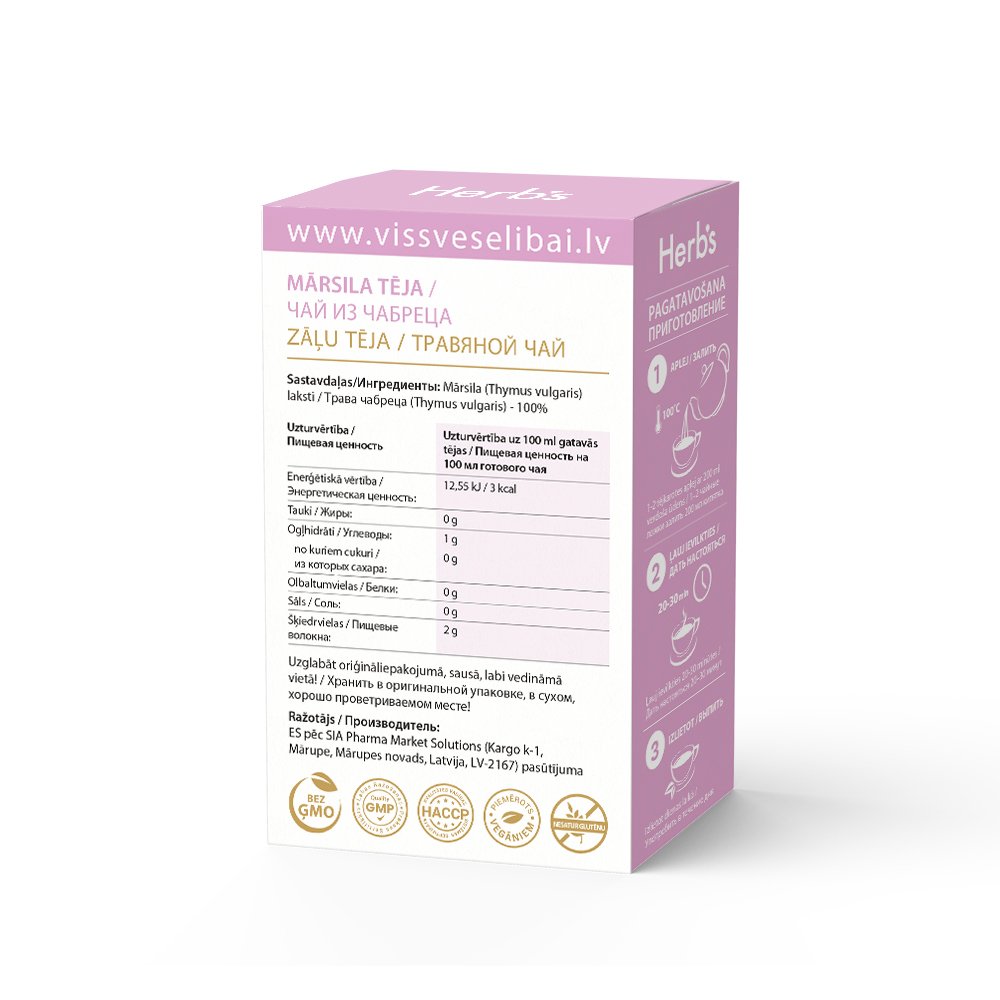 Sastāvdaļas: Mārsila laksti (Thymus vulgaris) – 100%