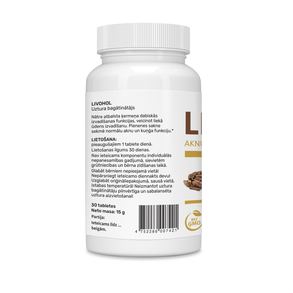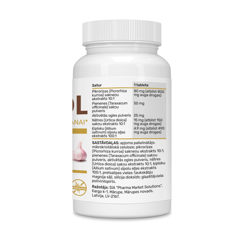 Sastāvdaļas: apjoma palielinātājs: mikrokristāliskā celuloze; pikrorīzas (Picrorhiza kurroa) sakneņu ekstrakts 10:1, pienenes (Taraxacum officinale) sakņu pulveris, aktivētās ogles pulveris, nātres (Urtica dioica) sakņu ekstrakts 10:1, ķiploku (Allium sativum) sīpolu eļļas ekstrakts 100:1, pretsalipes vielas: taukskābju magnija sāļi, silīcija dioksīds; glazētājviela: polivinilspirts.