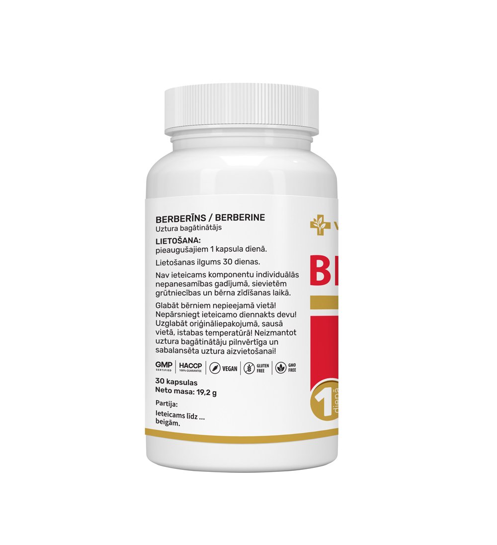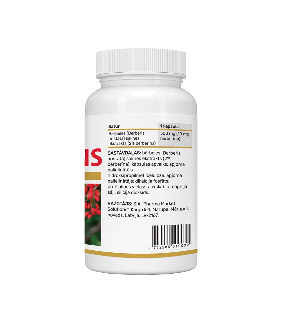 | Bārbeles (Berberis aristata) saknes ekstrakts (2% berberīna) | 500 mg (10 mg berberīna) |