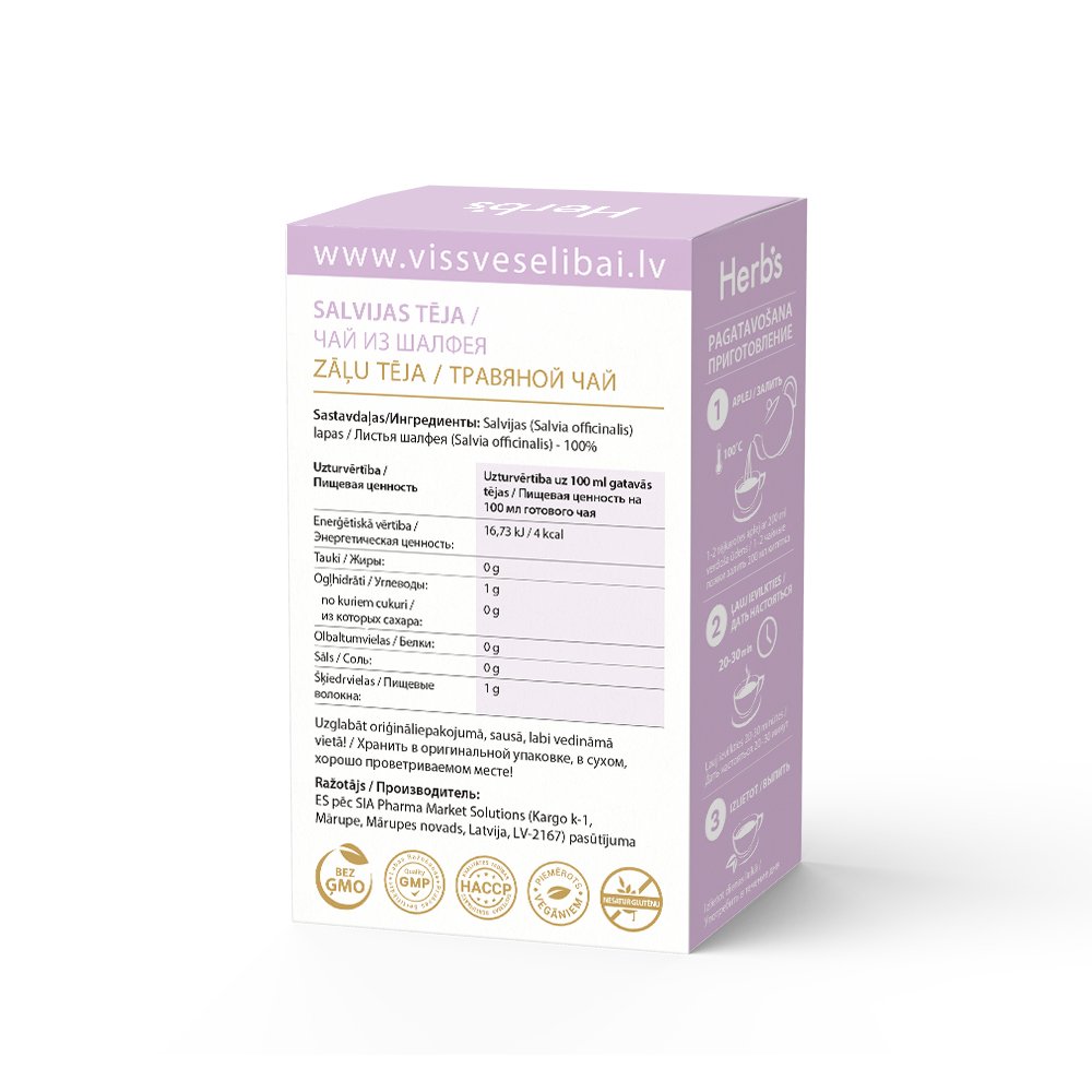 Sastāvdaļas: Salvijas lapas (Salvia officinalis) - 100%